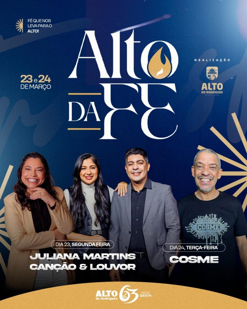 A Prefeitura de Alto do Rodrigues realiza, nos dias 23 e 24 de março de 2026, a segunda edição do Alto da Fé, evento que marca as comemorações dos 63 anos de emancipação política de Alto do Rodrigues. A iniciativa nasceu como promessa de campanha da prefeita Dra. Raquel Lemos e foi consolidada como extensão oficial da festa de emancipação, reunindo fé, música e devoção em dois dias de celebração.