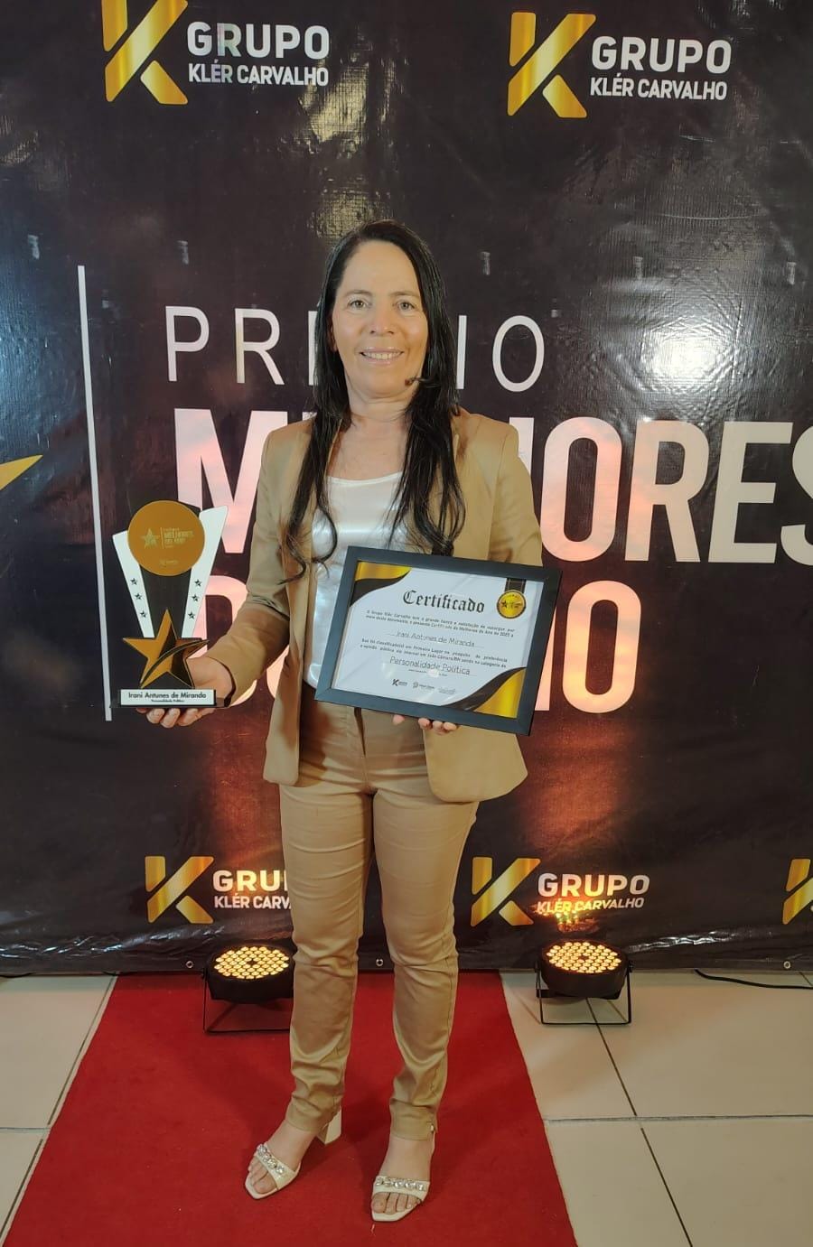 Na noite desta quinta-feira, 9 de outubro, a vereadora e professora Irani Antunes (PP) foi destaque no PrĂŞmio Melhores do Ano – TrofĂ©u KlĂ©r Carvalho 2025, onde recebeu o certificado e o trofĂ©u pela expressiva vitĂłria na categoria Personalidade PolĂtica.