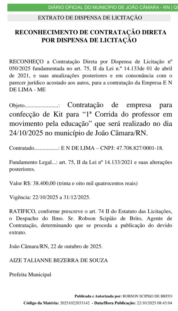 A Prefeitura Municipal de João Câmara, administrada pela prefeita Aize Bezerra, reconheceu e ratificou a Contratação Direta por Dispensa de Licitação nº 050/2025, com a empresa E N de Lima – ME, sediada no município de Pedro Velho, distante quase 200 km de João Câmara.