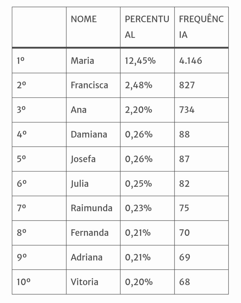 De acordo com o levantamento, Maria é o nome feminino mais frequente no RN, com 363.560 pessoas registradas. Em seguida aparecem Ana (76.775) e Francisca (52.102). A lista ainda traz nomes tradicionais como Antonia, Rita, Josefa, Júlia, Vitória, Laura e Letícia no top 10 feminino.