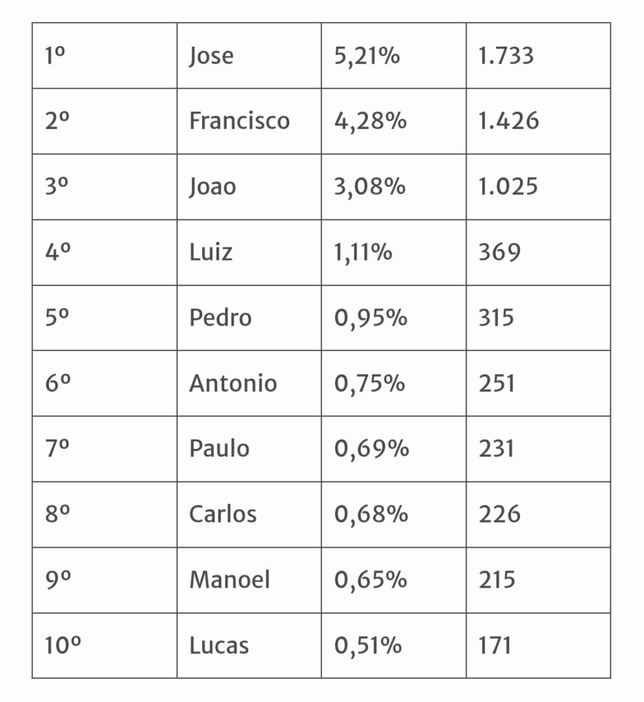 Entre os homens, o nome mais comum é José, que corresponde a pouco mais de 5,21% da população. Veja: