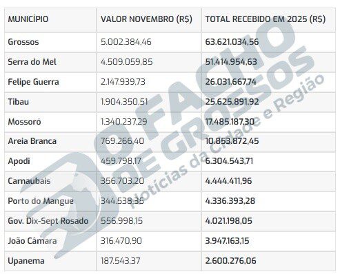 De acordo com levantamento realizado pelo Facho de Grossos, todos os municípios da região registraram queda nos repasses de novembro, quando comparados aos valores recebidos no mês anterior.