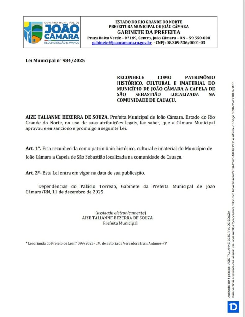 A prefeita Aize Talianne Bezerra sancionou, nesta quinta-feira (11), a Lei Municipal nº 984/2025, que reconhece oficialmente como Patrimônio Histórico, Cultural e Imaterial do município de João Câmara a Capela de São Sebastião, localizada na comunidade de Cauaçu.