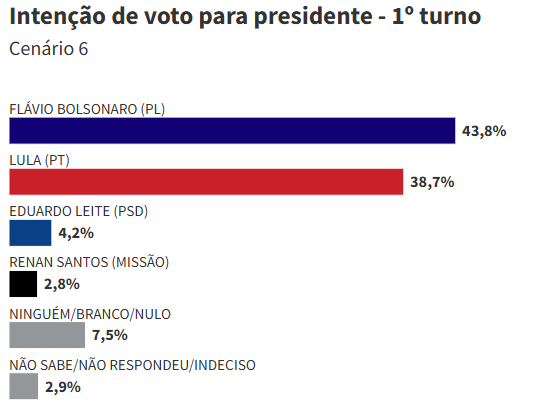 A maior vantagem doocorre no cenário 6: Flávio tem 43,8% das intenções de voto, contra 38,7% de Lula. Nesse cenário, Eduardo Leite soma 4,2% e Renan Santos, 2,8%. Brancos, nulos e ninguém representam 7,5%, e 2,9% estão indecisos.