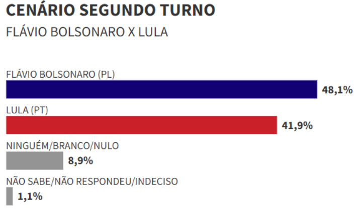 No segundo turno, Flávio também vence Lula. O senador aparece com 48,1% das intenções de voto, contra 41,9% do presidente. Brancos e nulos somam 8,9%, e 1,1% não soube ou não respondeu.