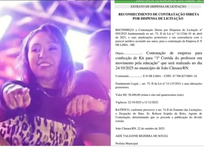 A Prefeitura Municipal de João Câmara, administrada pela prefeita Aize Bezerra, reconheceu e ratificou a Contratação Direta por Dispensa de Licitação nº 050/2025, com a empresa E N de Lima – ME, sediada no município de Pedro Velho, distante quase 200 km de João Câmara.