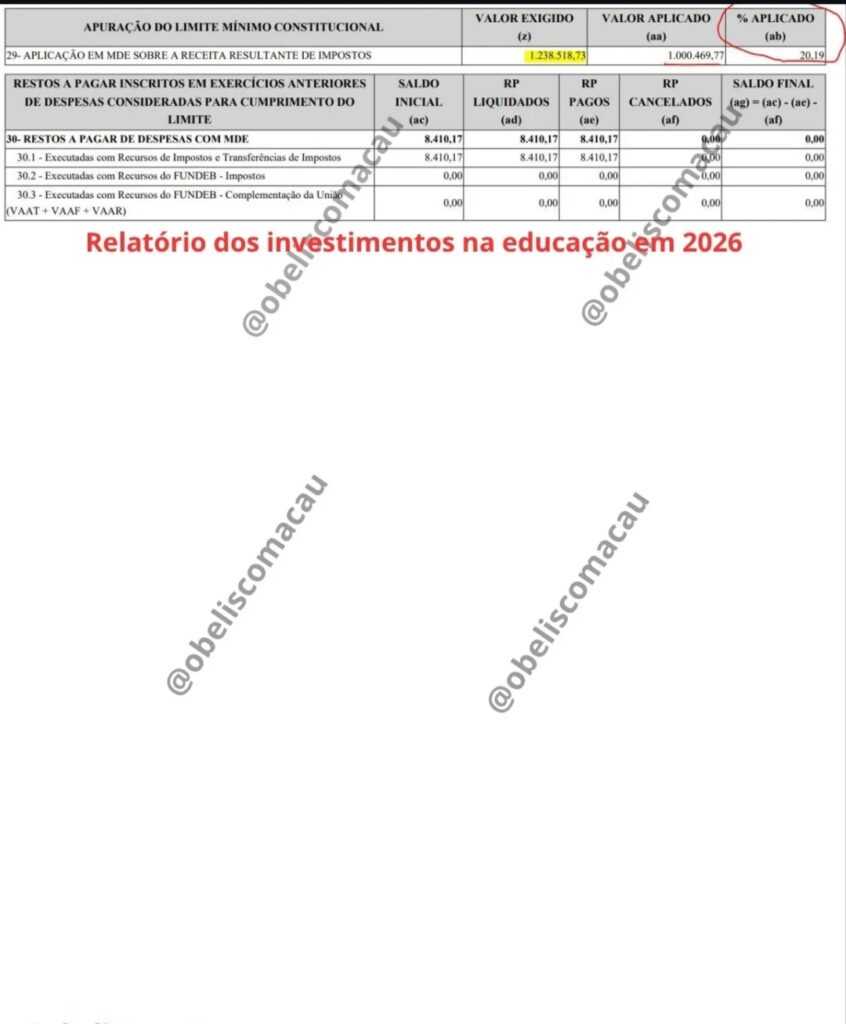 De acordo com os números referentes aos meses de janeiro e fevereiro, o valor mínimo exigido para aplicação em Manutenção e Desenvolvimento do Ensino (MDE) era de R$ 1.238.518,73. No entanto, a gestão aplicou apenas R$ 1.000.469,77 — um déficit de R$ 238.048,96.